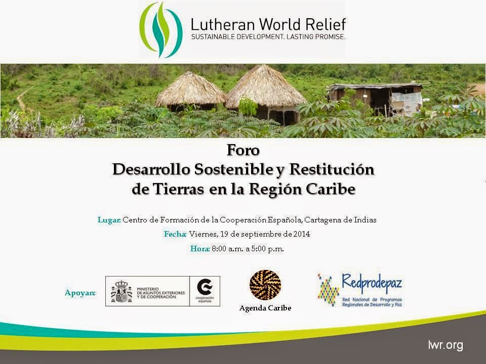 Lutheran World Relief, con el apoyo de la Red Prodepaz y la Red Agenda Caribe, les invitamos al Foro sobre Desarrollo Sostenible y Restitución de Tierras en la Región Caribe.