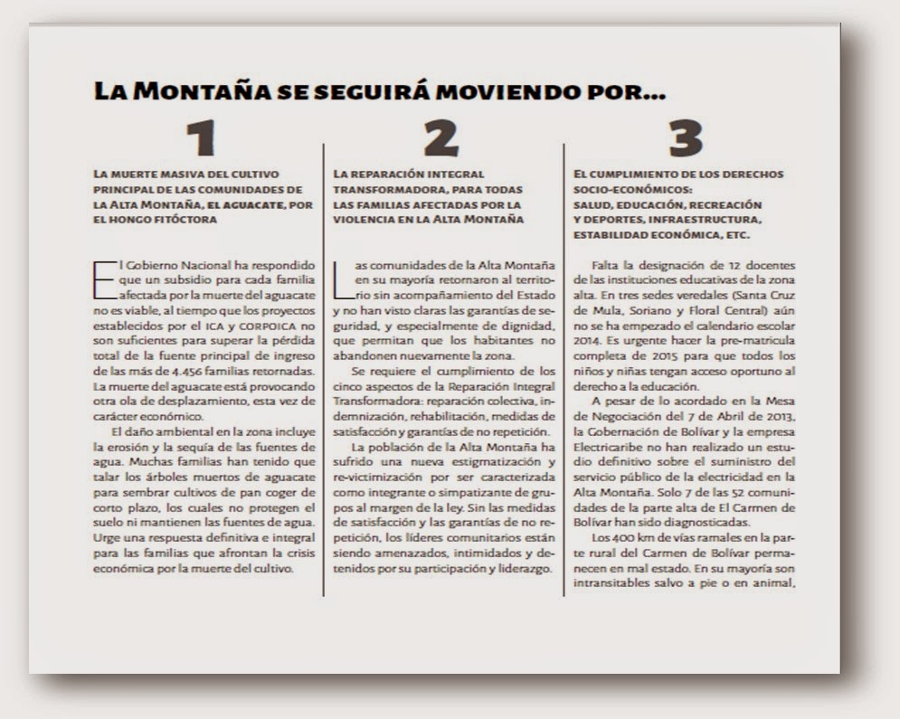Los y las campesinos de la Alta Montaña y demás personas victimizadas por el conflicto armado y las múltiples violencias en los Montes de María (Costa Caribe, Colombia), nos uniremos solidariamente, TOMADOS DE LA MANO, en una fraternal CADENA HUMANA, a lado y lado de la carretera troncal entre el corregimiento de Verdum hasta el municipio de San Jacinto sin interrumpir el tráfico. El 9 de Septiembre exigimos la presencia de miembros del gobierno nacional, departamental, y local en una Mesa de Diálogo sobre la situación actual en la Alta Montaña y todos los Montes de María.